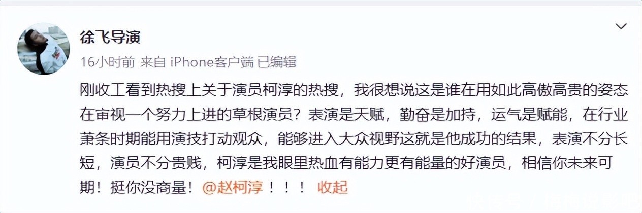 关键时刻,曾与柯淳合作的导演徐飞发文力挺:“我很想说这是谁在用如此高傲高贵的姿态在审视一个努力上进的草根演员?表演是天赋,勤奋是加持,运气是赋能”。徐飞还表示,在行业萧条时期,作为短剧演员能够进入大众视野,这就是他成功的结果,“表演不分长短,演员不分贵贱”,柯淳是好演员。